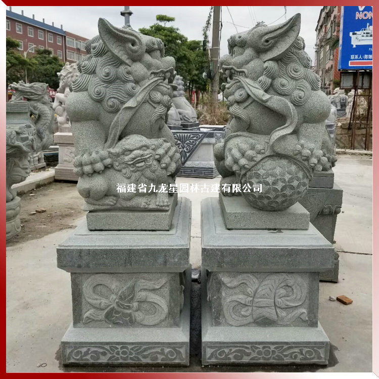 南派石獅子雕刻豐富,多彩有別,獻(xiàn)錢獅則是南派石獅子造型代表之一,因其以飾一串古錢而得名。因此,獻(xiàn)錢獅有著招**進(jìn)寶的寓意,因?yàn)樵煨秃B(tài)可掬,少了幾分獅子的威嚴(yán),多了幾分靈性,雄獅常飾于大串的銅錢,寓意招**進(jìn)寶。而雌獅則戲玩著小獅子,寓意人丁興旺之意,同樣也是人們熱衷于選擇的造型之一。獻(xiàn)錢獅是中國(guó)石雕獅子造型中常見的一種,同樣常見的還有北方傳統(tǒng)的京獅石雕獅子。