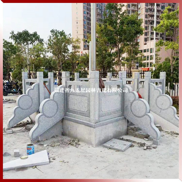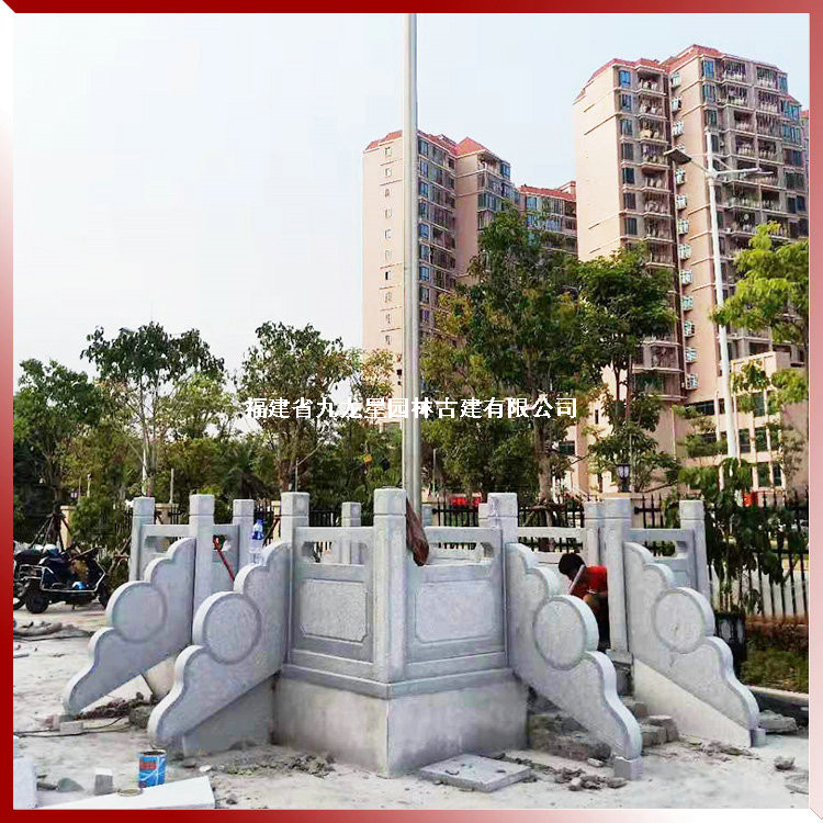 上圖石雕旗臺護欄,學校升旗臺石欄桿選用天然石材花崗巖生產加工,欄桿構件有立柱、柱頭、欄板、抱鼓等幾部分組成,由九龍星園林古建制作安裝。