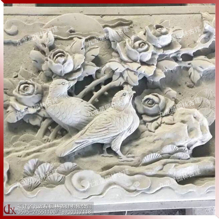 九龍星園林古建浮雕題材:生活風俗、神話故事,諸如吉慶有余、五谷豐登、龍鳳呈祥、平安如意、八仙祝壽、松鶴延年 、太平有象、鹿竹同春、五福臨門、喜鵲登梅、丹鳳朝陽等適用于寺廟浮雕、祠堂浮雕、建筑迎門墻、景區戶外大型建筑外墻石材浮雕。