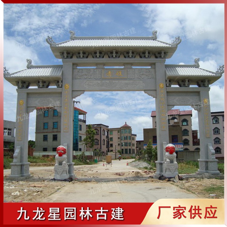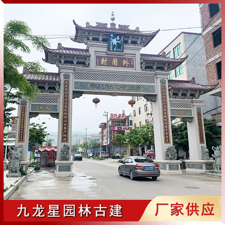 根據九龍星園林古建安裝的村口石牌坊來看,三門三樓式的石牌坊是村莊入口常見的石牌坊建造樣式。三門石牌坊也可以做成沖天式的,簡約大方,成本價格低,再經過雕刻師傅們的精致加工,石牌坊整體效果簡約大氣。如果在石牌坊的主體上帶上檐頂結構,加上中門和左右的兩個門這樣正好就是三門三樓式牌樓。當然也有復雜些的加工,做成三門五樓式的石牌坊,這樣的石牌坊造型就更加宏偉壯觀。